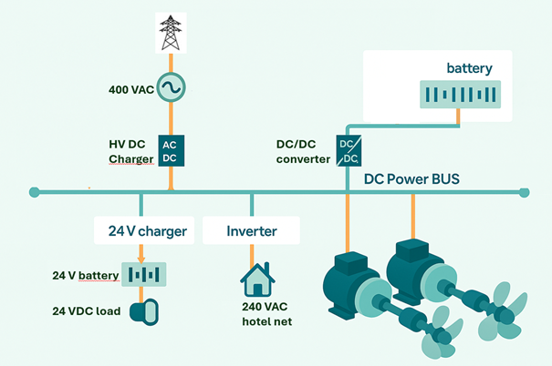 Both AC and DC motors can be used. In the diagram below, a DC onboard power system is implemented with DC motors. The DC grid is powered by a battery pack that is charged via a DC charger connected to the shore power grid when the vessel is docked.