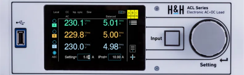 The H&H ACL series electronic loads are suitable for both DC and AC voltages up to a frequency of 1,000Hz. 1-phase and 3-phase models are available. Multiple single-phase units can be configured to a 3-phase in a parallel, star or delta configuration. There are also 3-phase models in one housing.